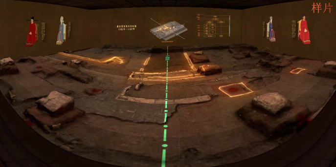 以正殿遺址所在之處為例,觀眾能在中區(qū)遺址的設(shè)計動線上看到三塊巨型幕布,將遺址北、東、西三面包圍住,通過視覺融合技術(shù)四面成像,打造成一個沉浸式CAVE空間,復(fù)原宮廷生活景象,以裸眼效果帶給觀眾身臨其境的感覺,觀眾可通過沉浸式互動解讀展示遺址信息,了解德壽宮遺址變遷及建筑營造制度,俯瞰臨安繁華,體驗?zāi)纤位始叶Y儀。